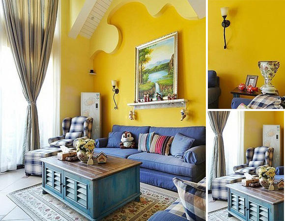 黃、藍紫和綠系列搭配體系是地中海風格辦公室裝修、賓館酒店裝修裝飾等工裝,和家庭辦公室、別墅裝修裝飾等家裝中色彩應用率低于藍白色系列搭配的第二大奇特色彩應用,是取自于南意大利向日葵、法國南部薰衣草花田中,金黃色、籃、紫花卉和綠葉相映襯,頗具情調的色彩組合,所以是又一大自然色彩組合成的地中海風格室內裝修裝飾色彩應用景觀。