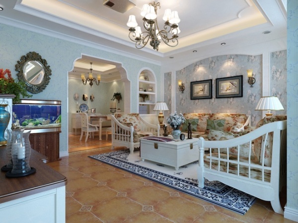 在歐式田園風(fēng)格的室內(nèi)裝修裝飾中,地面材質(zhì)多為天然石材或木地板,客廳中常用家具和軟裝飾共同營(yíng)造浪漫的整體效果,尤其是深色的橡木或楓木家具,配以色彩鮮艷的布藝沙發(fā),是一大特色。更為浪漫的是,歐式田園風(fēng)格家庭裝修裝飾、別墅裝修裝飾等家裝中常配以羅馬簾、精美的油畫、精良的雕塑工藝品等,不過(guò)需注意的是,浪漫設(shè)計(jì)在面積較大的空間中會(huì)表現(xiàn)的十分壯觀,而如果是小戶型的歐式田園風(fēng)格卻難以彰顯得淋漓盡致。