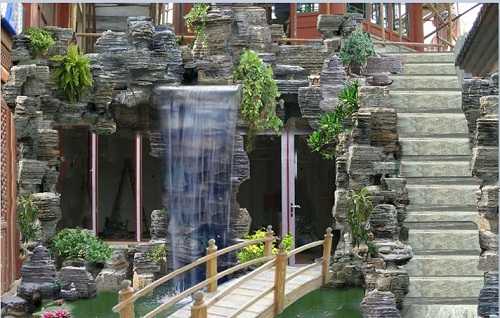 用山石做卷邊處理,雖然不太符合自然物象,但是只有這樣才能確保瀑布沿著墻體、山體比較平穩(wěn)地滑落下來,并且最好再作坡面處理。在進(jìn)行瀑布的設(shè)計(jì)和建造中,還必須事先確定好瀑布的水量,這樣更有助于讓瀑布產(chǎn)生最佳的視覺、聽覺效應(yīng),因?yàn)樗看舐洳畲螅暩,氣勢更壯觀,而如果是水量小,落差大卻讓瀑布失去了真正的內(nèi)涵,難以激起人們的興致,反而會(huì)人們失落很多。